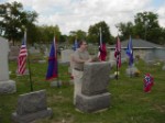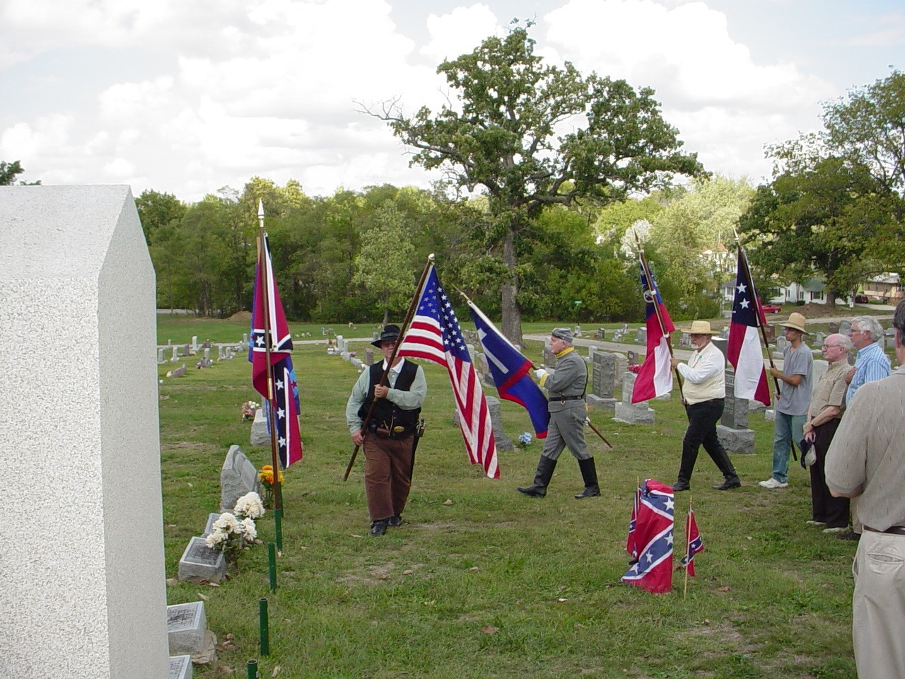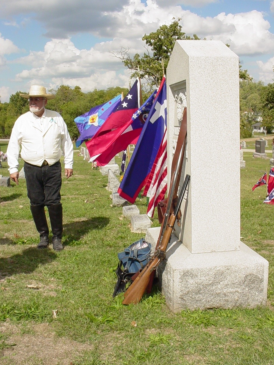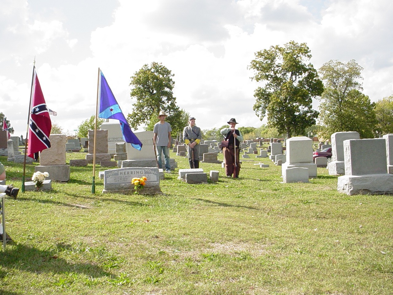 On February 19, 1871, George married Josima McNerva Allen. She is buried next to him in Hillcrest. She was born April 16, 1854 in Callaway Co., Missouri and died December 6, 1922 in Fulton. She was a daughter of John Karah Allan and Mary L. Walker Sparks of Kentucky and Tennessee. She was a granddaughter of Joseph Darby Allen and Mary Margaret Murphy of Pennsylvania and North Carolina, and, Thomas Walker and Bettie Langley of Tennessee. George W. Herring was a private in Company E, 9th Missouri Infantry Regiment, Confederate States Army. He was surrendered with his regiment on May 26, 1865 at New Orleans, LA., and was paroled at Alexandria, LA., June 7, 1865. George and Josima Herring were the parents of 12 children; Dolor Washington Herring, Clyde Robert "Bob" Herring, Seth "Jack" Herring, Myrtle Herring Divers McCormick, Mayme May Herring Waters, Brent Herring, Grover Herring, Herbert V. Herring, Norman "Pete" Herring, Allen Herring, Ruby Herring, and Woodson Herring, all born in Callaway county. In attendence at this memorial ceremony were four of his great grandchildren; Jan P. Herring, Scott Herring, John C. Herring, and Mary Jo Herring Hubbard. Also attending were two great great grandchildren, Jennifer Herring and Deanna Herring Lee, and two great great great grandchildren, Amanda and Zach Lee. Also attending were Walter "Chic" Herring, great nephew, and Jim Harrison, a great great nephew who assisted in the ceremony and gave a talk about the Confederate Army in Callaway county. Return to George Washing Herring Jr. page |
