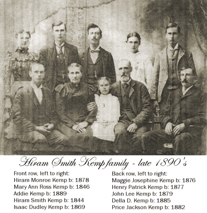 Hiram Smith Kemp family, late 1890's. Hiram S. Kemp was my 2nd cousin 4 times removed. He married Mary Ann Ross on Aug 11, 1867. Seated left to right; Hiram Monroe Kemp (b: 1878, later married Bertie Cleveland), Mary Ann Ross Kemp (b: 1846), Addie Kemp (b: 1889, later married Rufus T. Payne), Hiram Smith Kemp (b: 1844), Isaac Dudley Kemp (b: 1869 married Martha A. Victoria Pasley). Back row, left to right: Maggie Josephine Kemp (b: 1876), Henry Patrick Kemp (b: 1877), John Lee Kemp (b: 1879), Della D. Kemp (b: 1885 later married Luther Moore), Price Jackson Kemp (b: 1882).