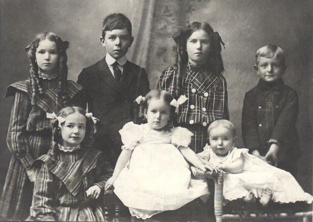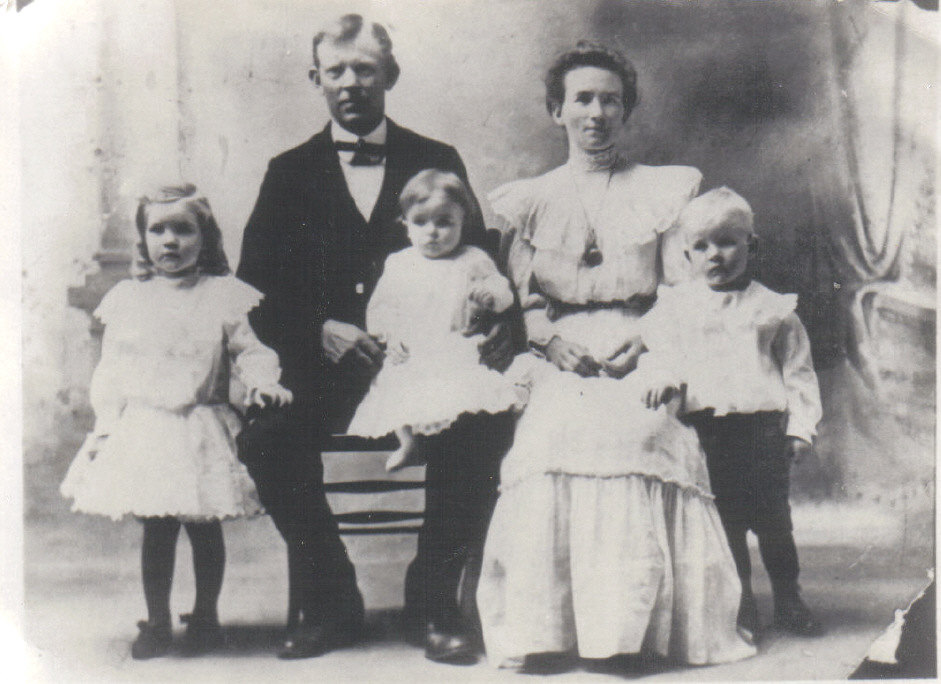 The Wilks family in 1907, children of James Rufus and Oddie Eizabeth Day Wilks. Back row from left: Iris (born 1898), Leo (born 1894), Elizabeth Overton (born 1896), Ira [Judge] (born 1898). Front row from left: Mary Leona [my grandmother] (born 1900), Dollie Ora (born 1904), and Virginia (born 1907).