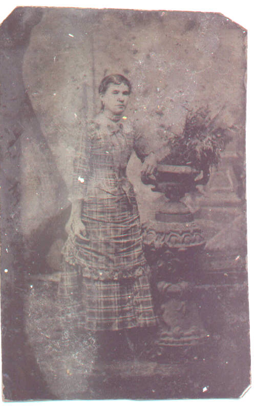 Permelia Frances Overton Day, daughter of Benjamin F. and Ann S. Holt Overton of Callaway Co. Mo. She was the first wife of Sanders Perfect Day. Permelia was my 2nd Great Grandmother, mother of Oddie Day Wilks. This tintype picture was taken about 1878 in Texas, 2 years before her death. She would have been about 25 years old in this picture.
