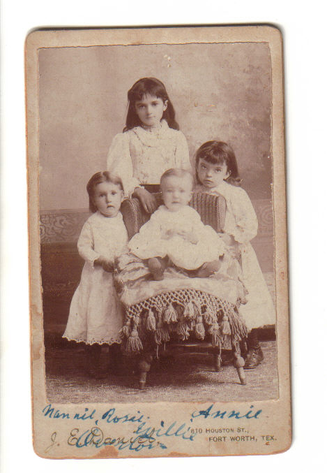 From left: Nannie, Rosie, Willie, and Annie Overton, children of William and Mattie Overton. (same family as above picture) This picture was taken about 1891 in Fort Worth Tarrant Co. Texas. These children were my 1st cousins 3 times removed.