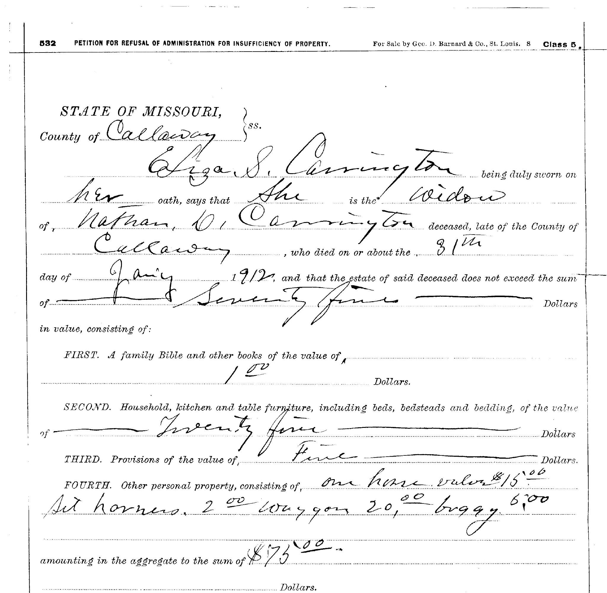 Eliza S. Carrington being duly sworn on her oath says that she is the widow of Nathan D. Carrington deceased late of the County of Callaway, who died on or about the 31st day of January, 1912, and that the estate of said deceased does not exceed the sum of __ Seventy Five __ dollars in value, consisting of: