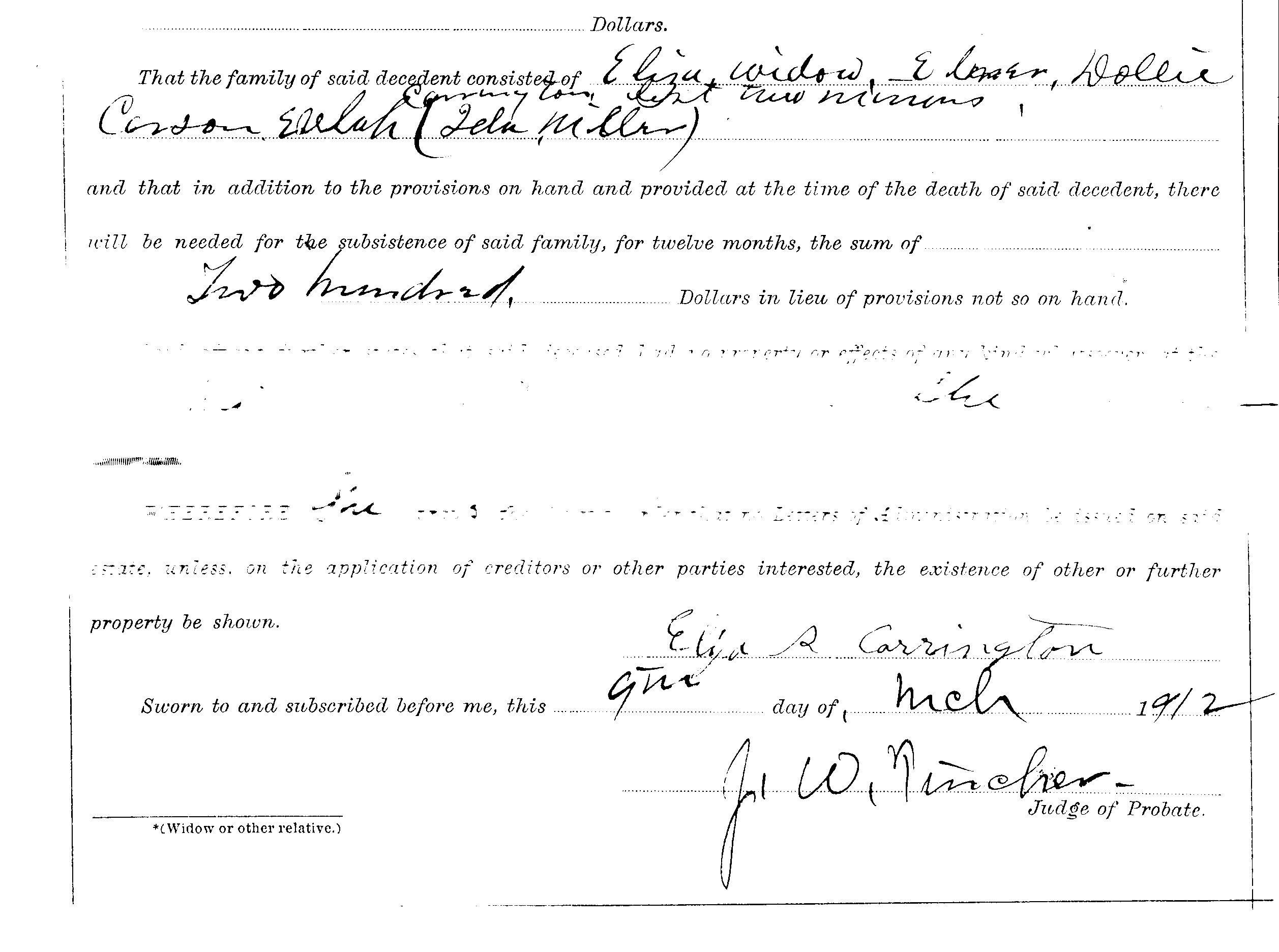 That the family of said decedent consisted of Eliza, widow, Elmer, Dollie, Carson, Eulah Carrington, last two minors, Ida Millard. and that in addition to the provisions on hand and provided at the time of the death of said decedent, there will be needed for the subsistence of said family for twelve months, the sum of Two hundred Dollars in lieu of provisions not so on hand.